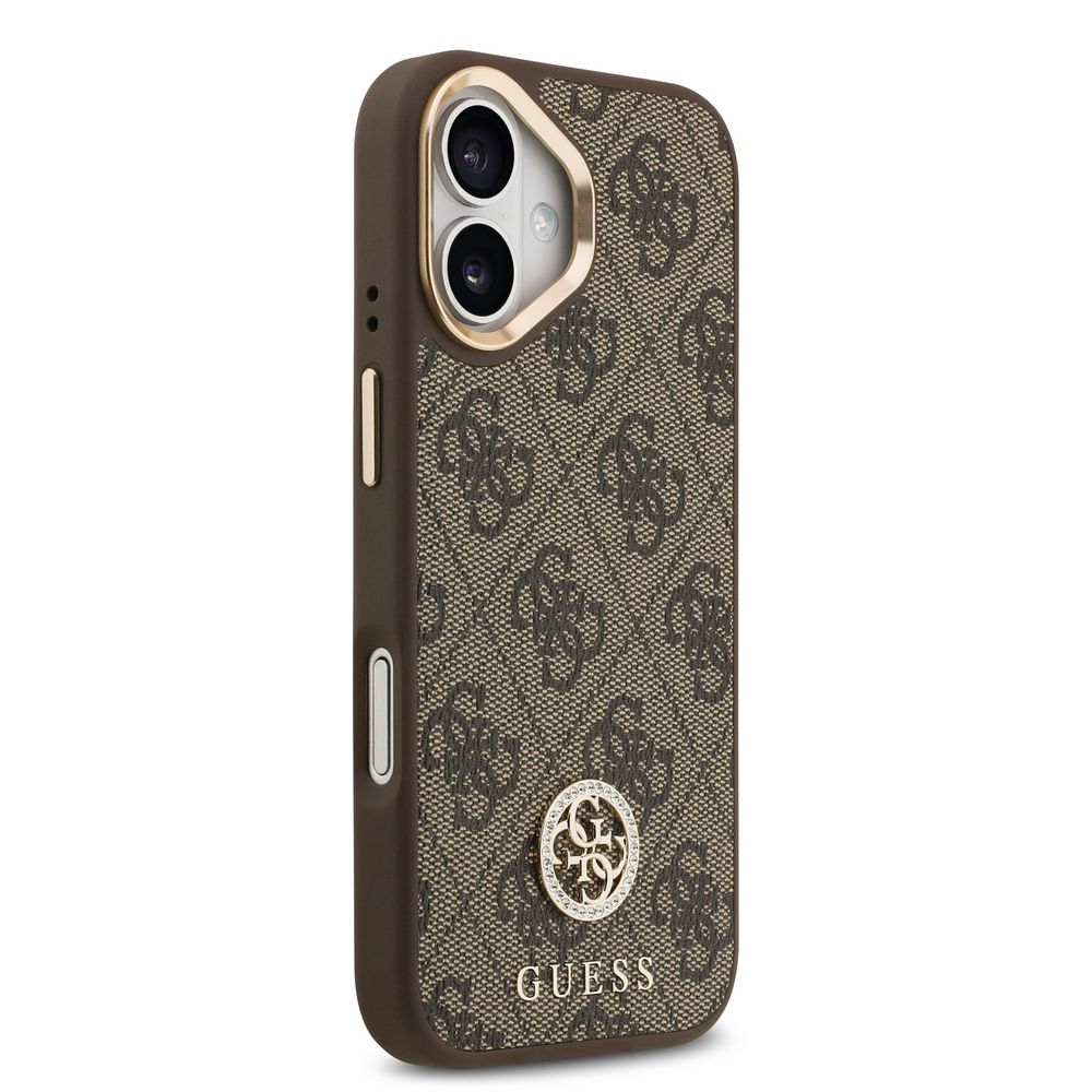 Θήκη Guess με διακριτικό χρυσό 4G metal logo με strass TPU και επικάλυψη δερματίνης μεταλλικά χρυσά κουμπιά και κομψό strap λαιμού για iPhone 17 καφέ