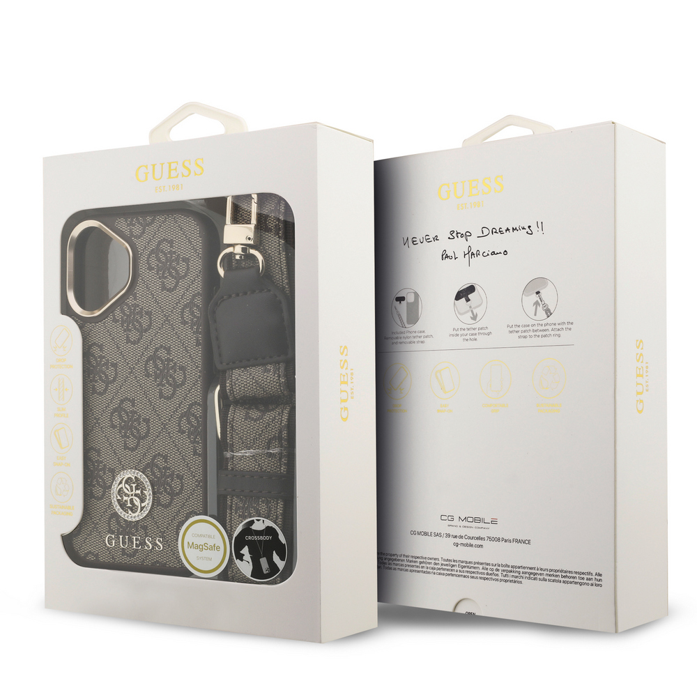 Κομψή καφέ θήκη με το εμβληματικό 4G μοτίβο της Guess και στυλάτο strap λαιμού – Συνδυάζει fashion προστασία με πρακτικότητα για hands-free χρήση