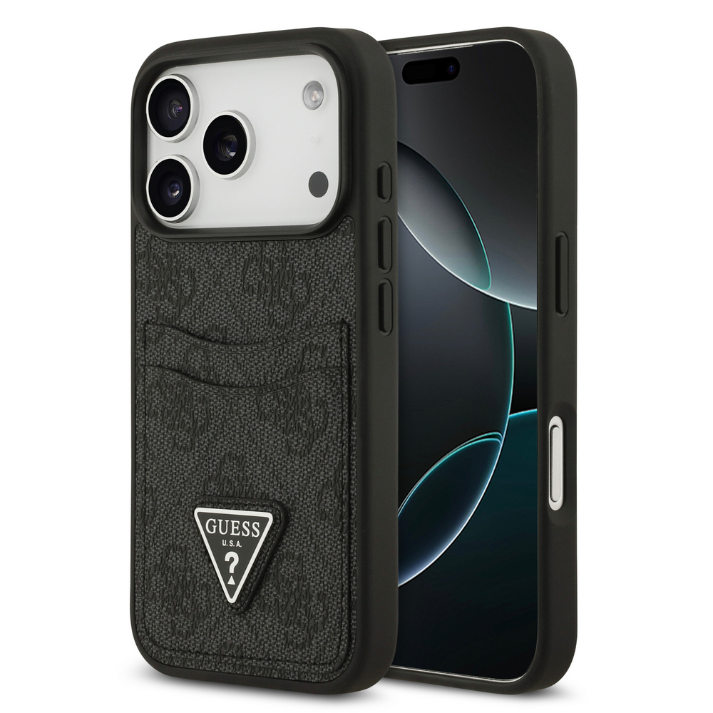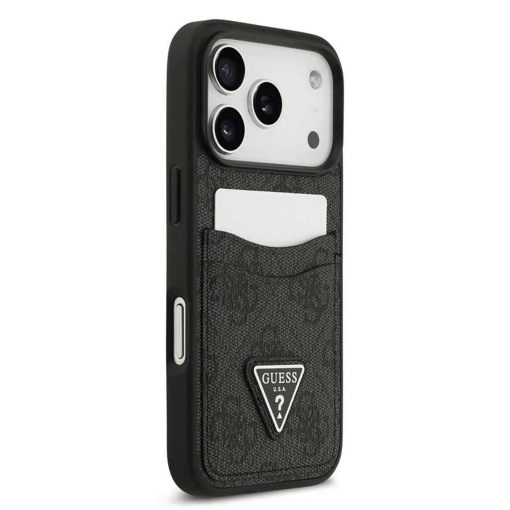 Κομψή θήκη Guess με χαρακτηριστικό τρίγωνο logo σε ανάγλυφο μαύρο σχεδιασμό με δύο θήκες καρτών – Συνδυάζει την υψηλή αισθητική με πρακτικότητα για το iPhone 17 Pro