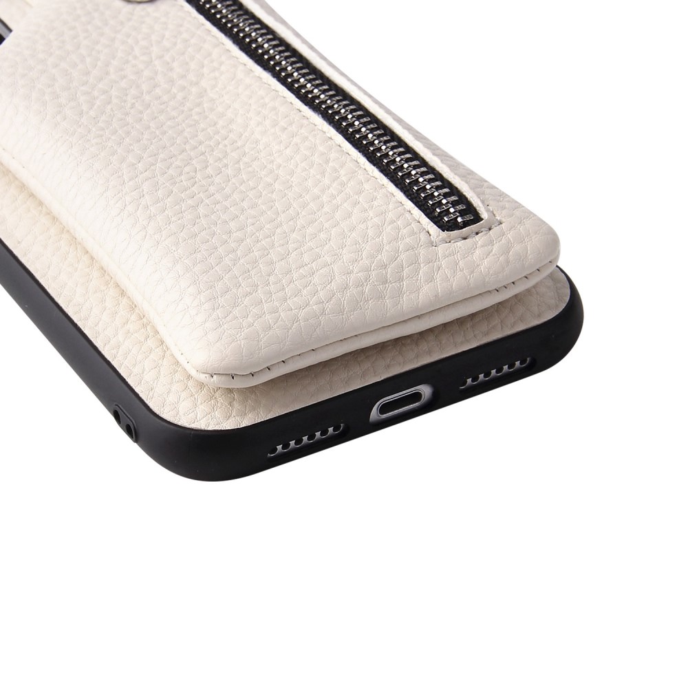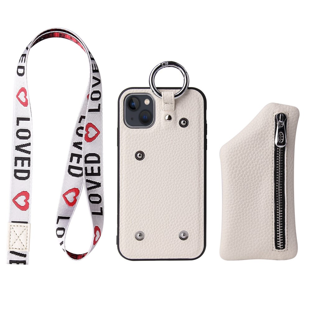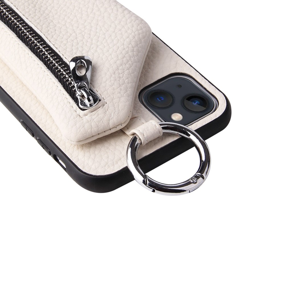 Θήκη iPhone 14 Plus Mad Mask πλάτη δερματίνης με κορδόνι και πορτοφόλι με φερμουαρ από αντικραδασμικό TPU λευκό