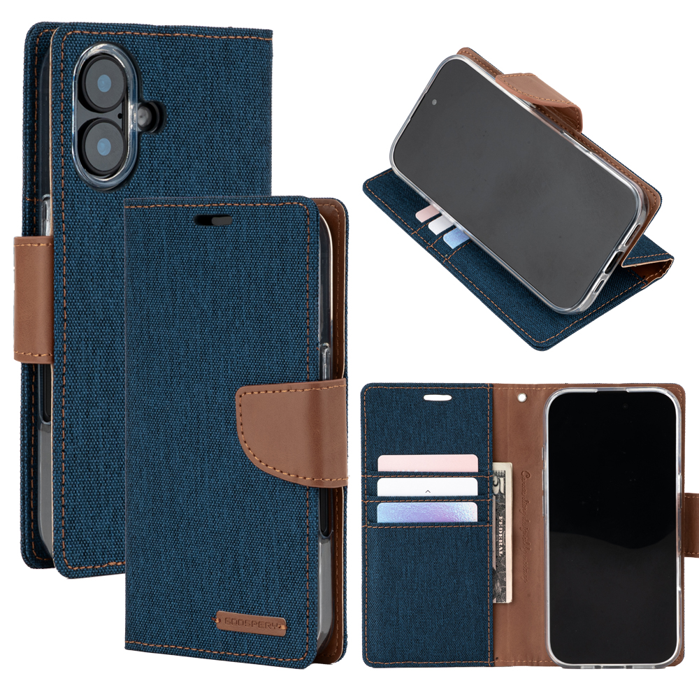 Θήκη Mercury Goospery® Canvas Diary book με βάση στήριξης, υποδοχές καρτών και μαγνητικό κούμπωμα για iPhone 17 – μπλε/ καφέ