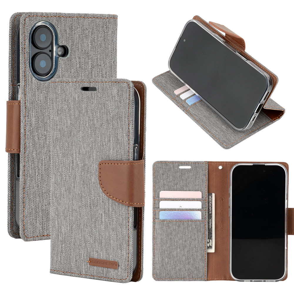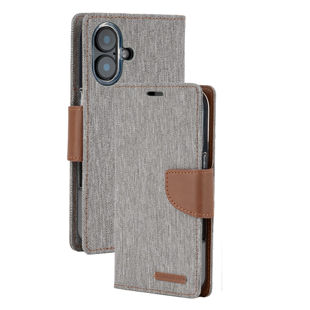 Θήκη Mercury Goospery® Canvas Diary book με βάση στήριξης, υποδοχές καρτών και μαγνητικό κούμπωμα για iPhone 17 – γκρι/ καφέ