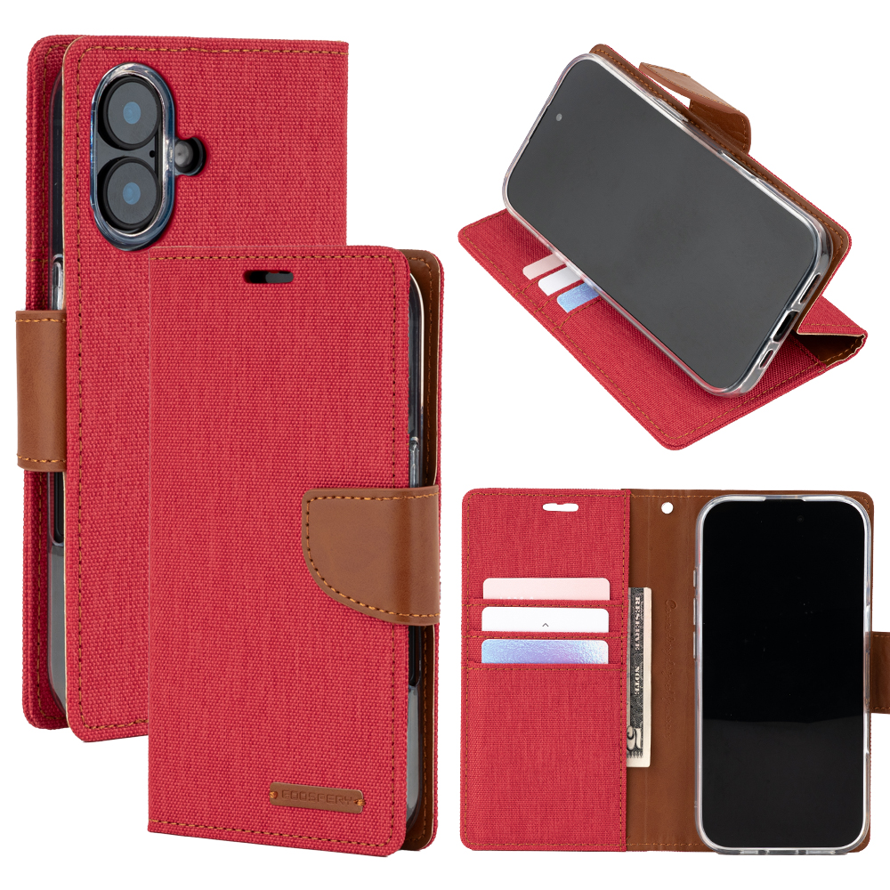 Θήκη Mercury Goospery® Canvas Diary book με βάση στήριξης, υποδοχές καρτών και μαγνητικό κούμπωμα για iPhone 17 – κόκκινο/ καφέ