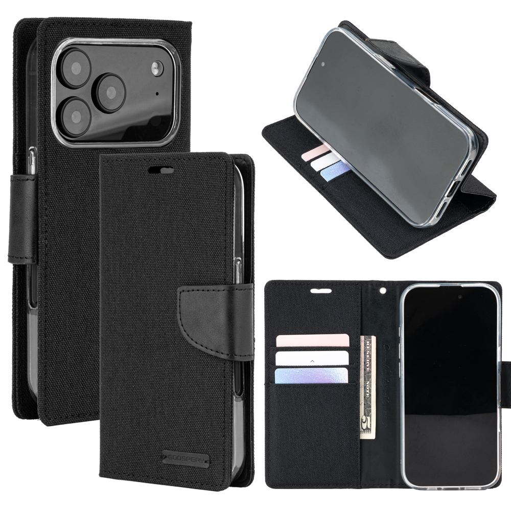 Θήκη Mercury Goospery® Canvas Diary book με βάση στήριξης, υποδοχές καρτών και μαγνητικό κούμπωμα για iPhone 17 Pro – μαύρο