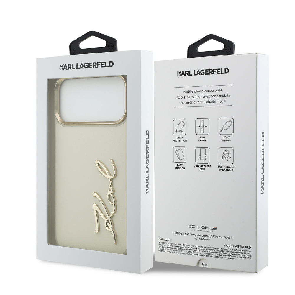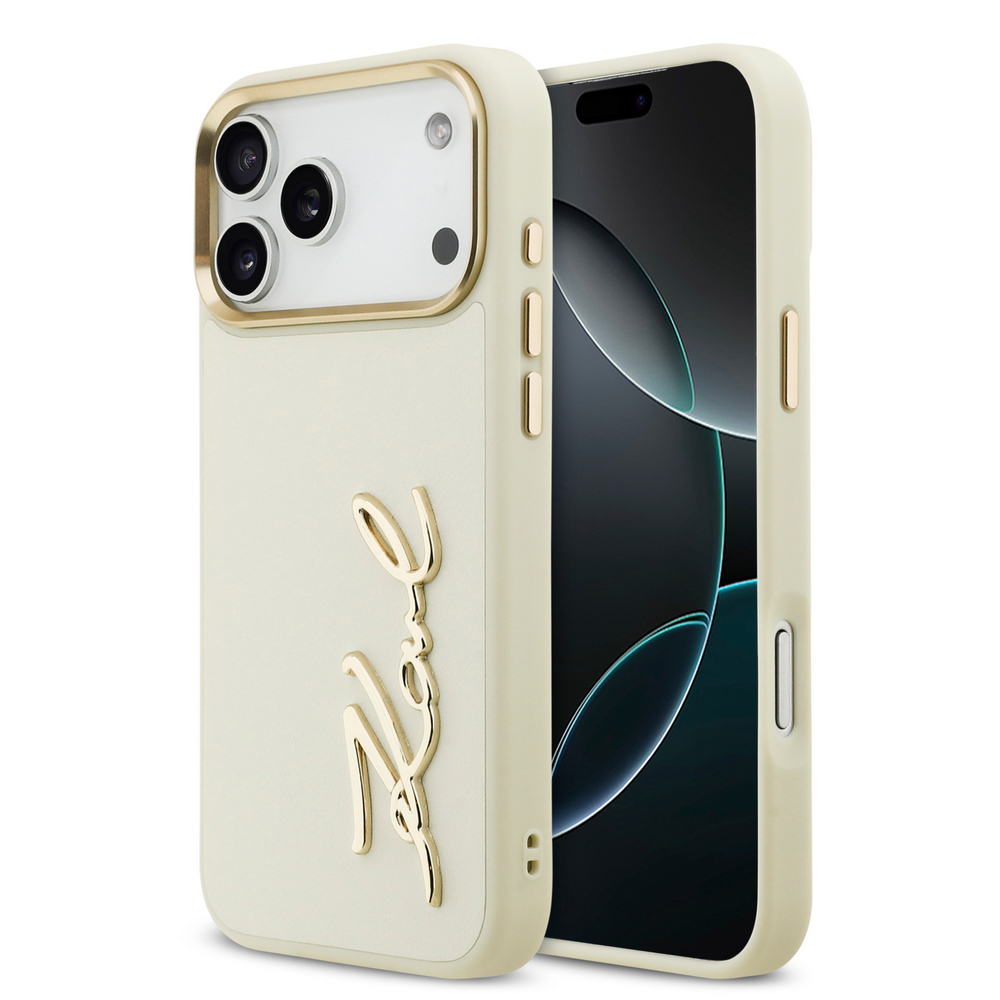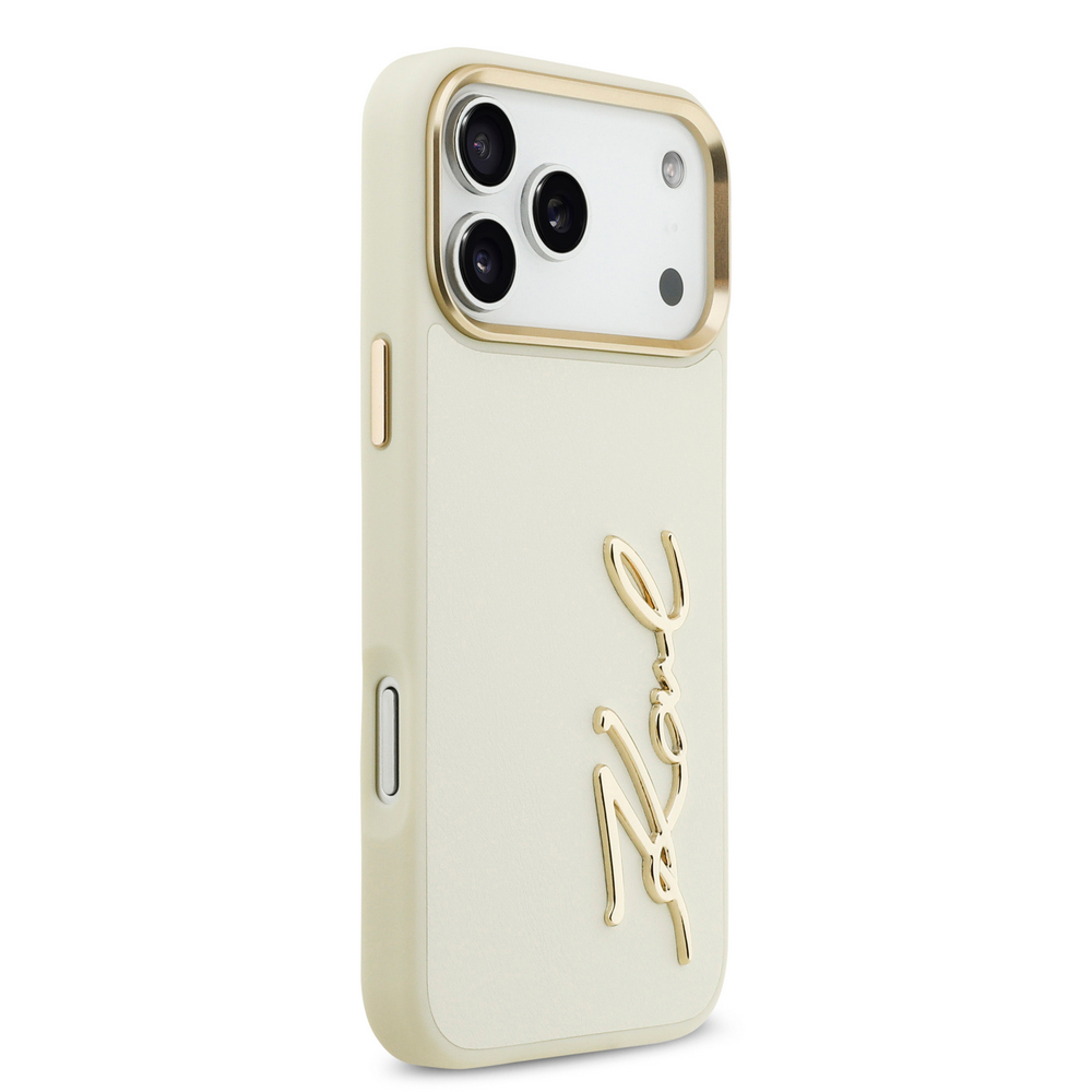 Θήκη Karl Lagerfeld Magsafe με χρυσή μεταλλική ανάγλυφη υπογραφή Karl και χρυσά πλαινά κουμπιά για iPhone 17 Pro Max μπεζ