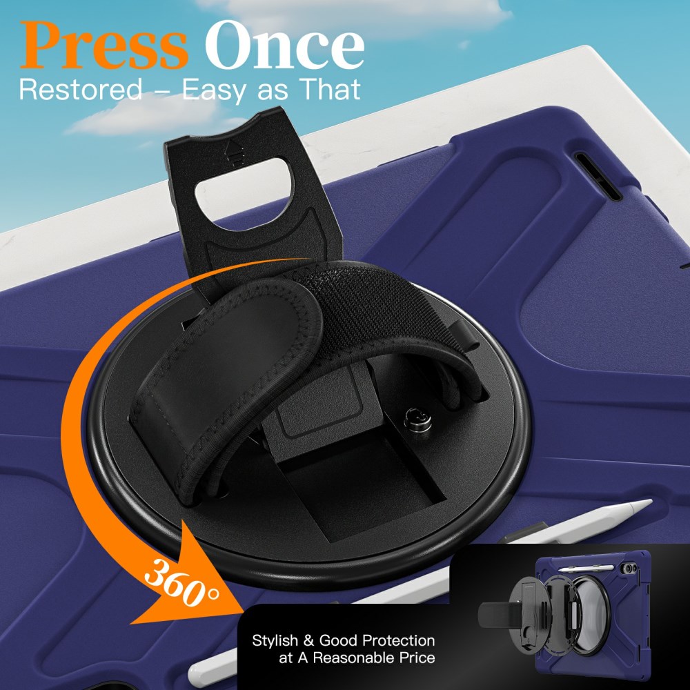 Η Σκληρή Θήκη PC+TPU για το Samsung Galaxy Tab S11 Ultra συνδυάζει τρία στρώματα προστασίας με ενσωματωμένο Stand και περιστρεφόμενο Λουράκι 360 μοιρών. Κατασκευασμένη από premium υλικά TPU, PC και σιλικόνη, η μπλε θήκη διαθέτει ενισχυμένες γωνίες σιλικόνης για μέγιστη απορρόφηση κραδασμών και προστασία από πτώσεις.
