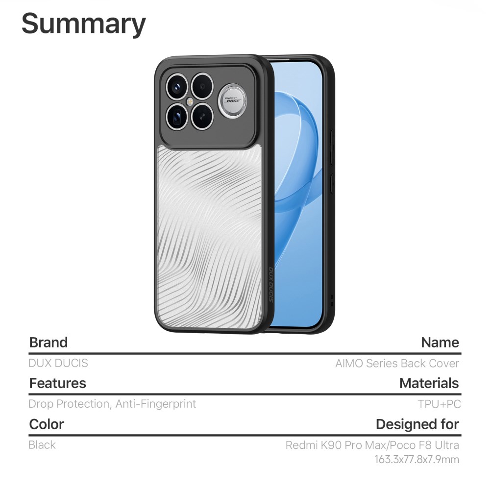 Η Σκληρή Πλάτη PC+TPU της σειράς DUX DUCIS Aimo Series για το Xiaomi Redmi K90 Pro Max 5G / Poco F8 Ultra συνδυάζει ανθεκτικότητα και κομψό σχεδιασμό σε μαύρο χρώμα. Η frosted επιφάνεια με αισθητικές ρέουσες γραμμές στη πλάτη προσφέρει άνετο κράτημα και σύγχρονη εμφάνιση. Πιστοποιημένη με REACH Certification, εγγυάται ασφάλεια υλικών υψηλών προδιαγραφών.