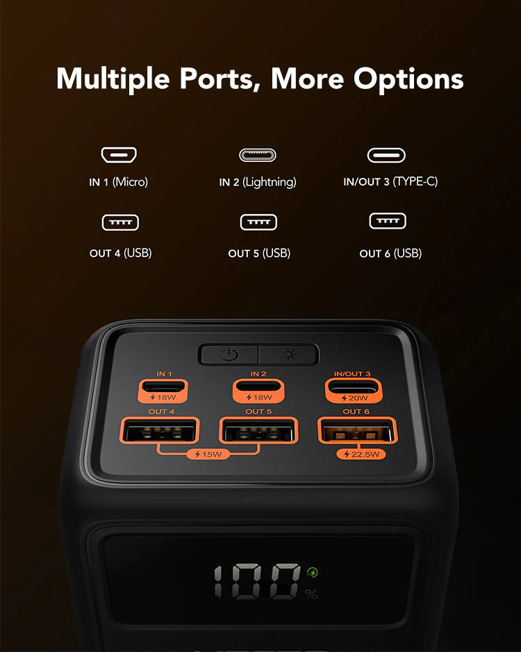 USB-A με 22.5W max, USB-C PD 20W, plus QC 3.0. Τρεις θύρες εισόδου (USB-C, Lightning, Micro USB) και τρεις θύρες εξόδου USB-A – φορτίζετε πολλές συσκευές ταυτόχρονα.